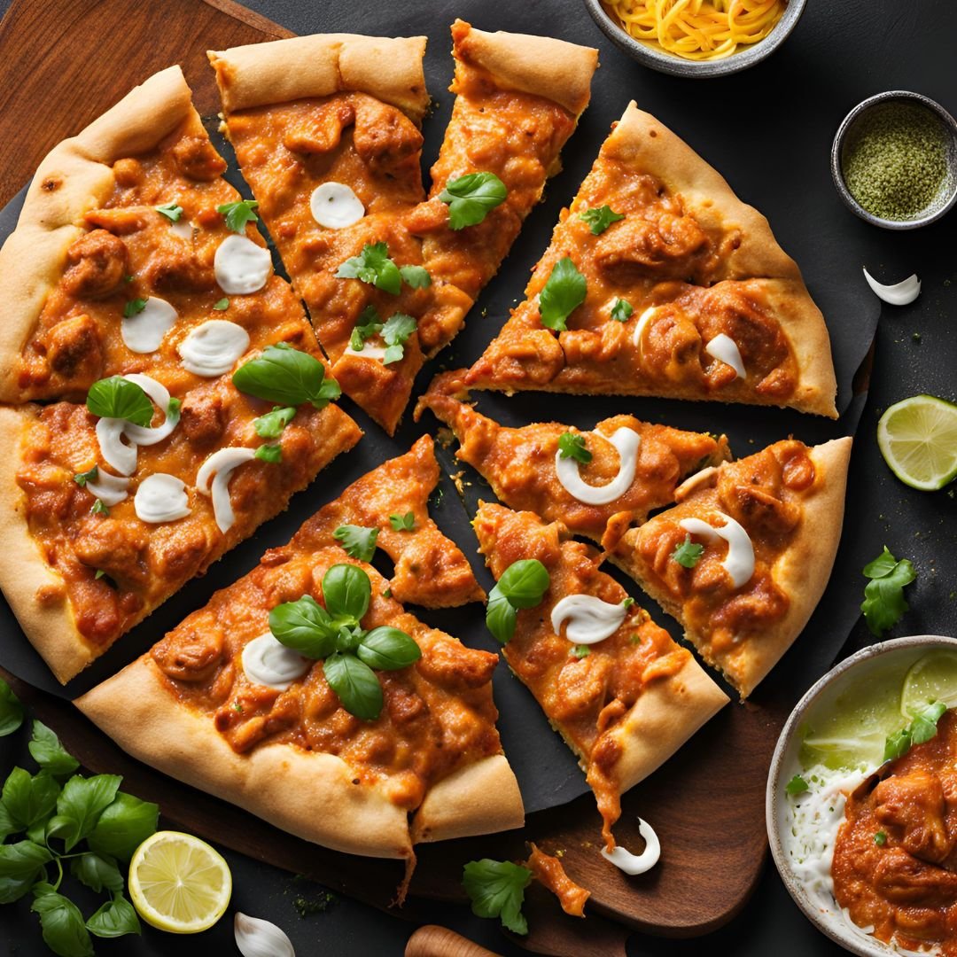 A fusion of creamy butter chicken curry and melted cheese on a crispy pizza base.