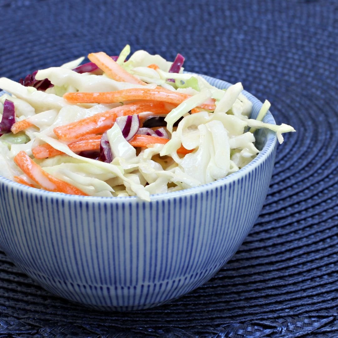 Shredded cabbage and carrot dressed with yogurt, mustard seeds, and a pinch of salt and sugar.