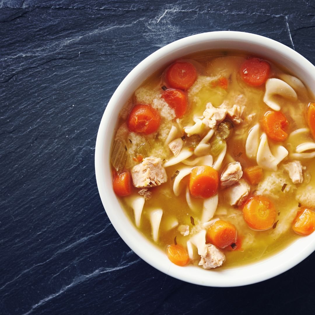 A comforting soup with tender chicken, noodles, and a flavorful broth, enriched with vegetables and herbs.