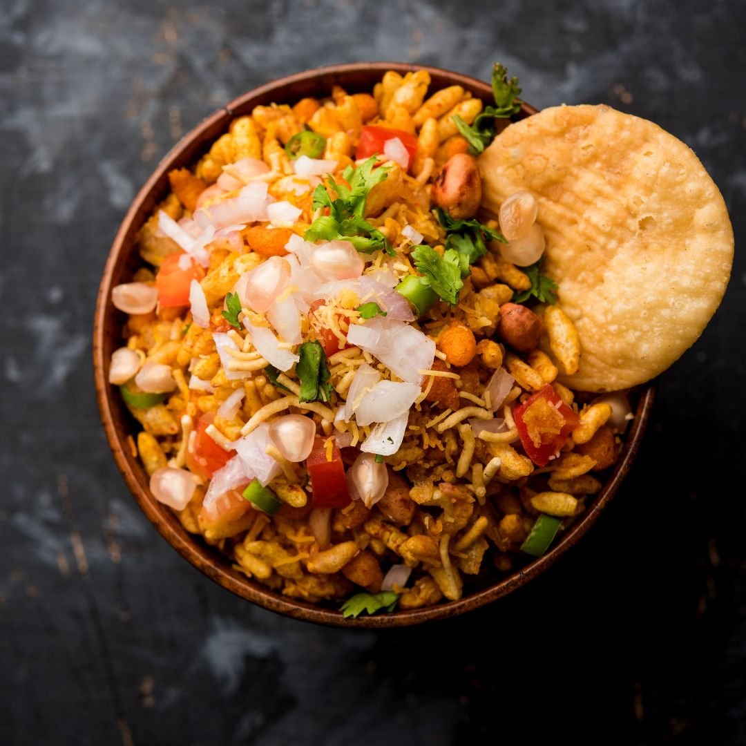Topped with a mix of spiced vegetables like onions, tomatoes, capsicum, corn, and a hint of chaat masala.