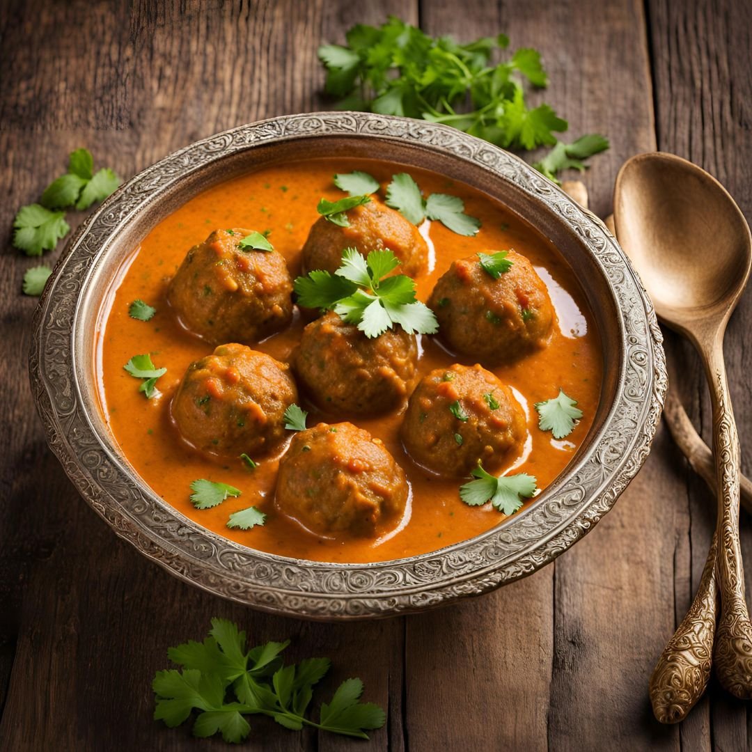 A rich and creamy curry made with deep-fried dumplings (koftas) made from mashed vegetables or paneer, served in a flavorful, spiced tomato-based gravy.