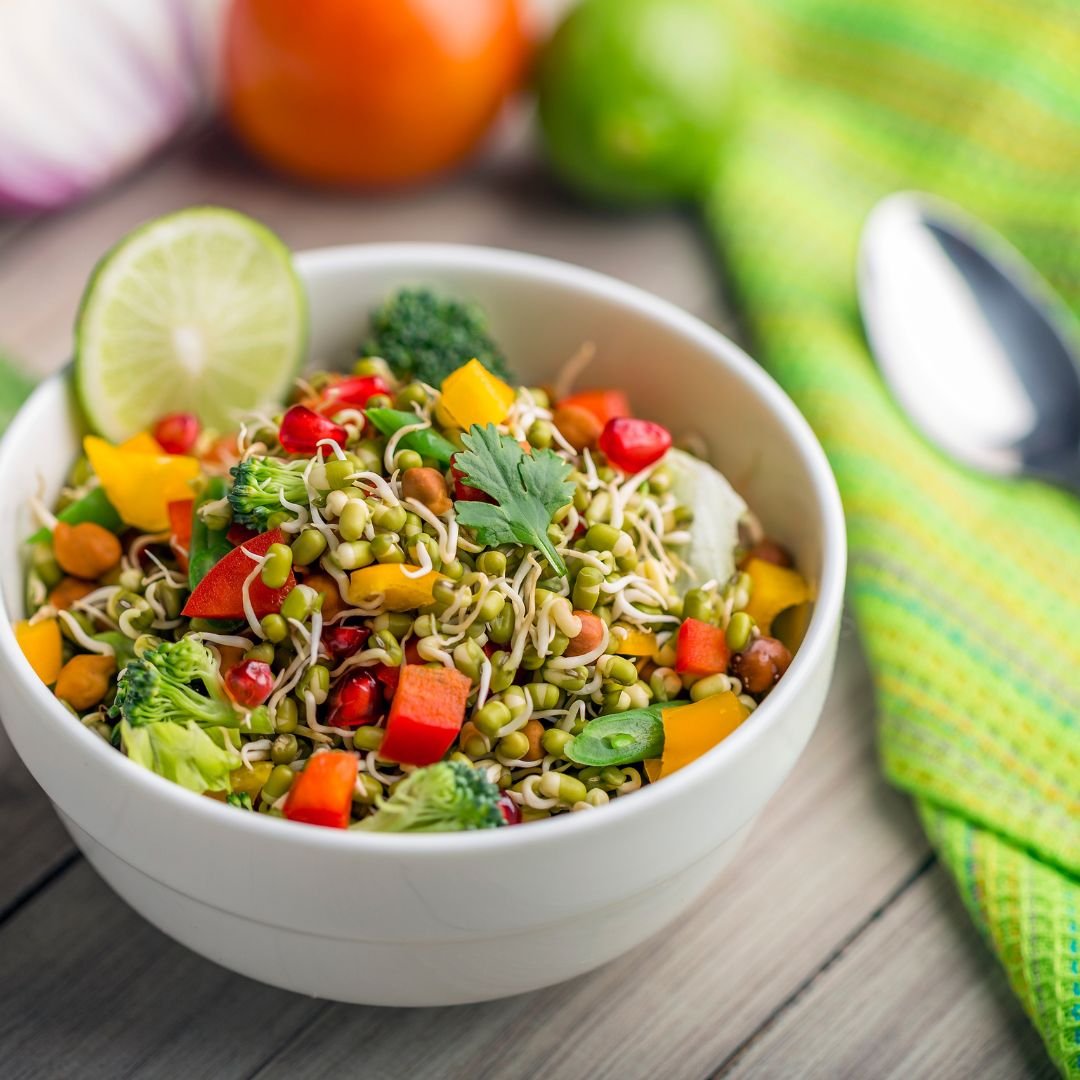 A protein-rich salad made with sprouted green gram, chopped veggies, and a tangy lemon dressing.