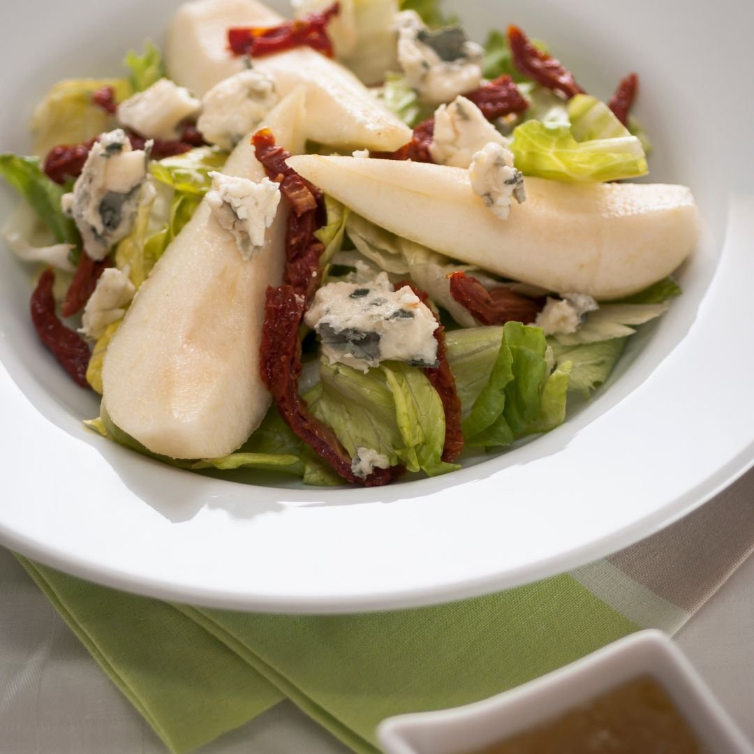 A crunchy salad featuring stilton and chinese cabbage.