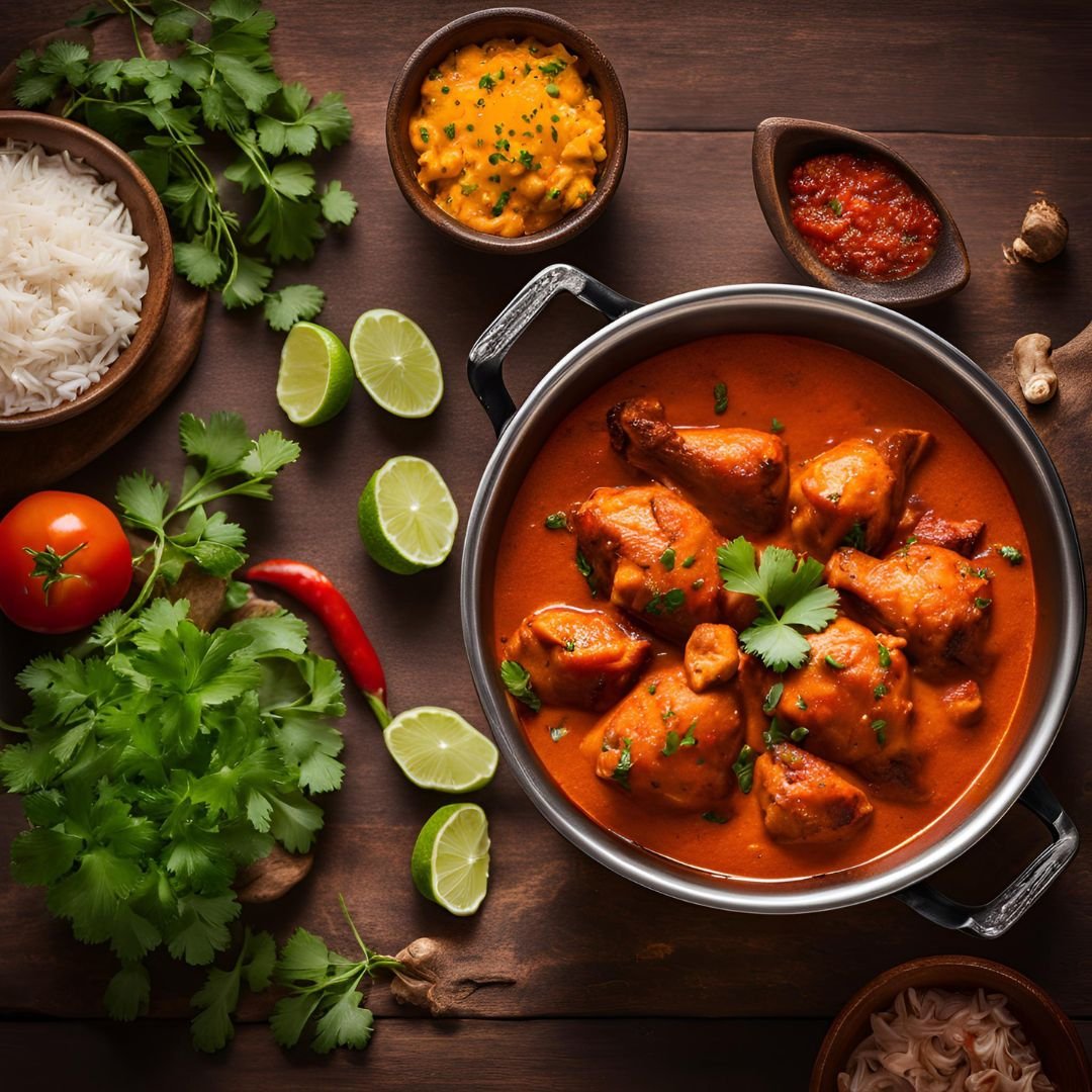 Grilled tandoori chicken pieces simmered in a rich, flavorful curry sauce, typically made with tomatoes, cream, and spices.