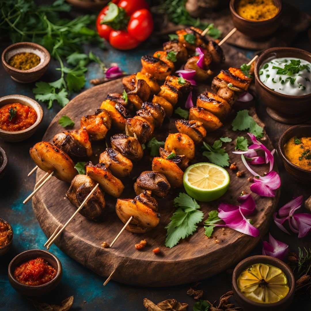 Soft cubes of paneer marinated in spiced yogurt, skewered with veggies, and grilled.