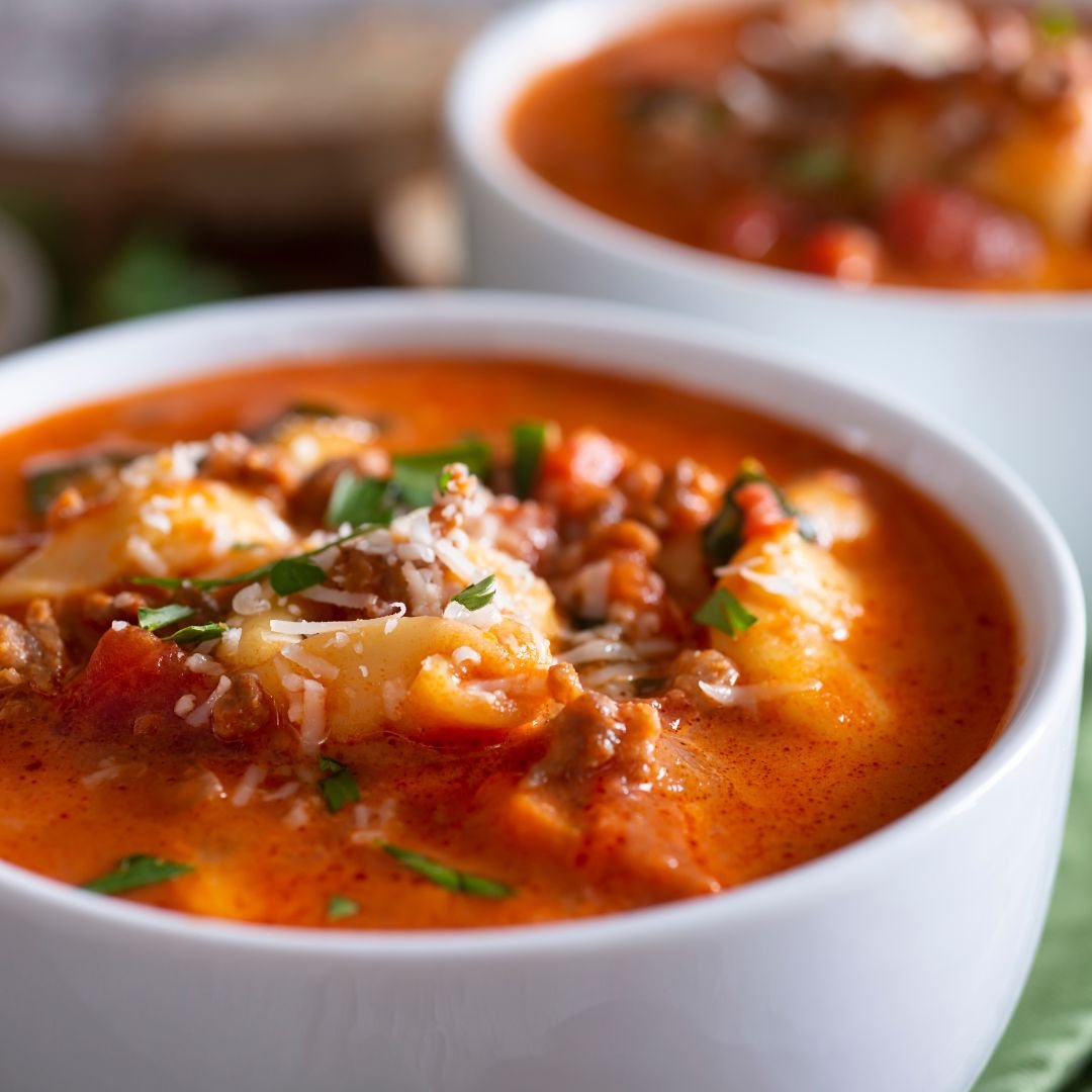 An Italian-inspired soup featuring cheese or meat-filled tortellini cooked in a savory broth, often with vegetables and herbs.